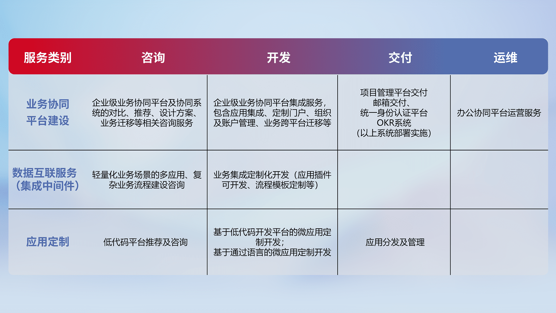 针对钉钉、、、企微、、、IDaas等平台级产品提供产品的规划、、、方案、、交付、、、、定制化开发等服务,,,实现如统一协同办公、、、、智能客户服务、、混合会议管理、、、智能数据查询、、、等业务场景,,实现数字化转型。。
